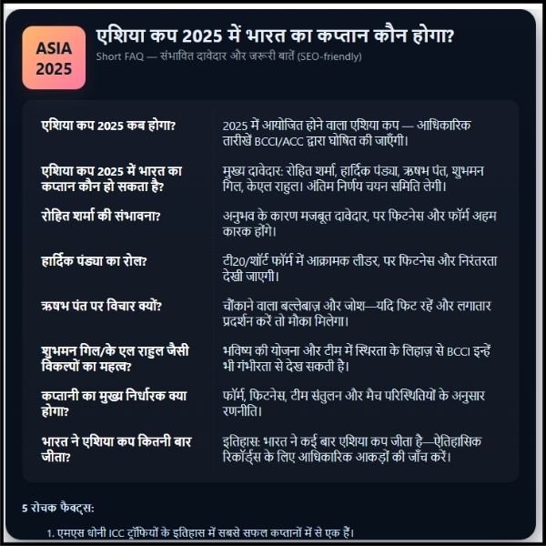 | एशिया कप 2025 में भारत का कप्तान कौन हो सकता है? | रोहित शर्मा, हार्दिक पंड्या, ऋषभ पंत, शुभमन गिल या केएल राहुल। |