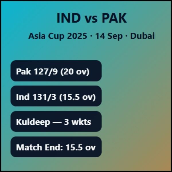 - Player of the Match: Kuldeep Yadav — 3 विकेट लिए और पाकिस्तान को नियंत्रण से बाहर किया। Crictoday+1