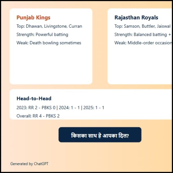 पर अगर Punjab Kings के बल्लेबाज चल गए — खासकर Livingstone और Dhawan — तो RR के लिए मुश्किल खड़ी हो सकती है।